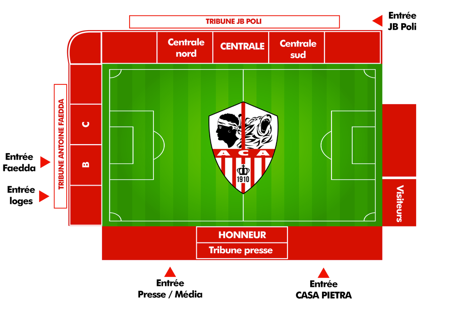 2 buvettes se trouvent en tribune A. Faedda, 3 espaces de restauration en tribune JB Poli et un espace de restauration en tribune Honneur.