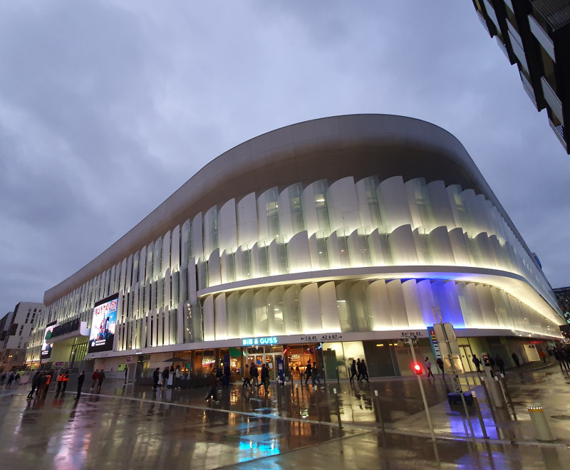 600 écailles géantes en aluminium et en verre composent les façades extérieures du bâtiment ; on y trouve le plus grand écran géant interactif au monde.