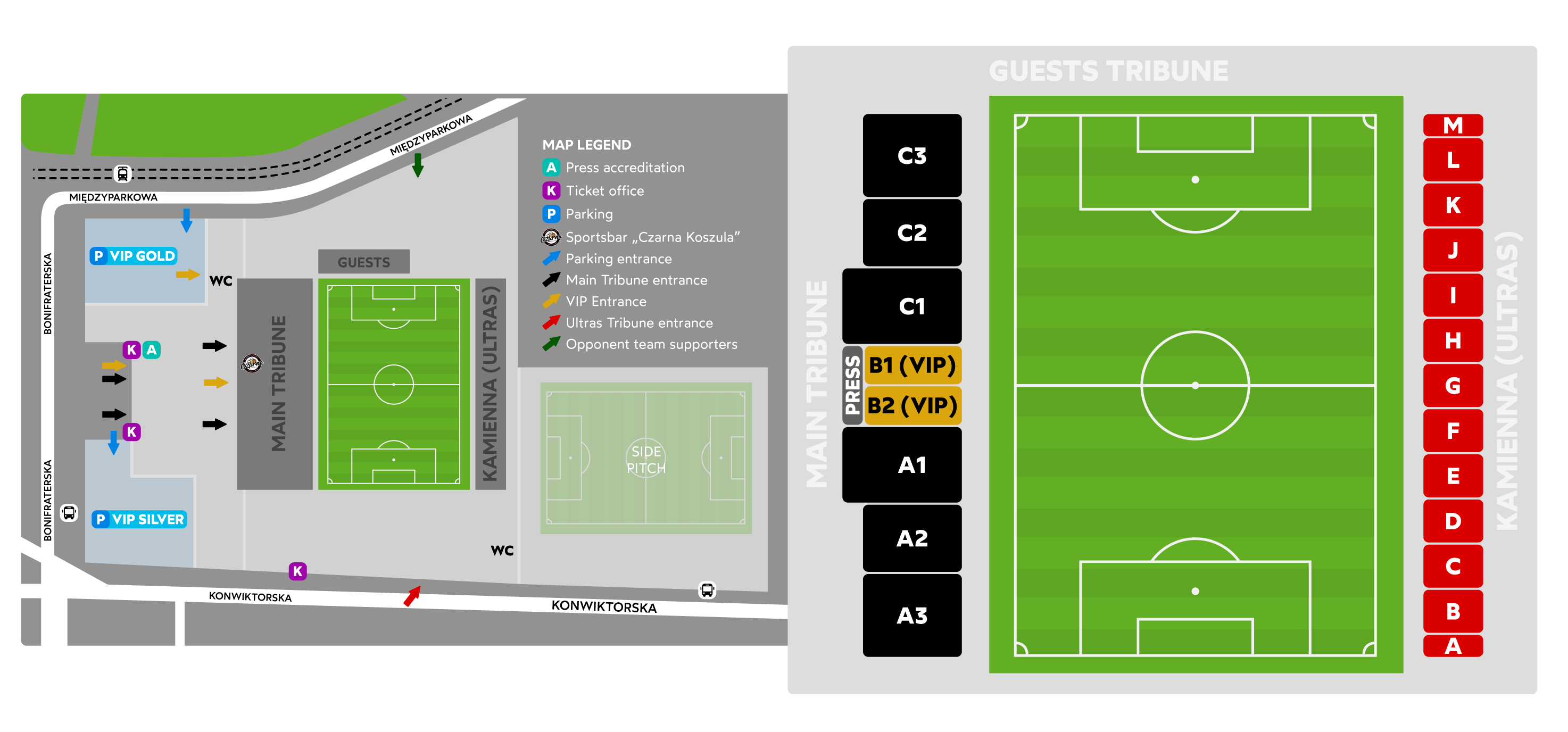 - Tribune visiteurs (Gości) : une "cage" typique des stades polonais.
